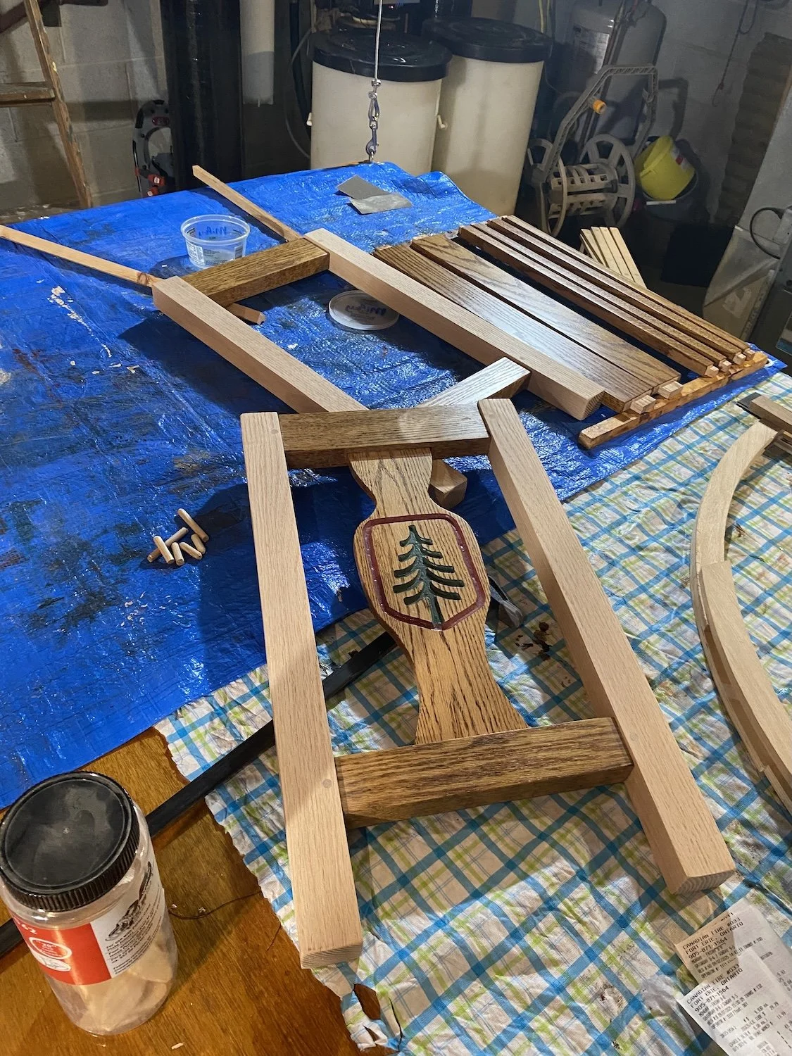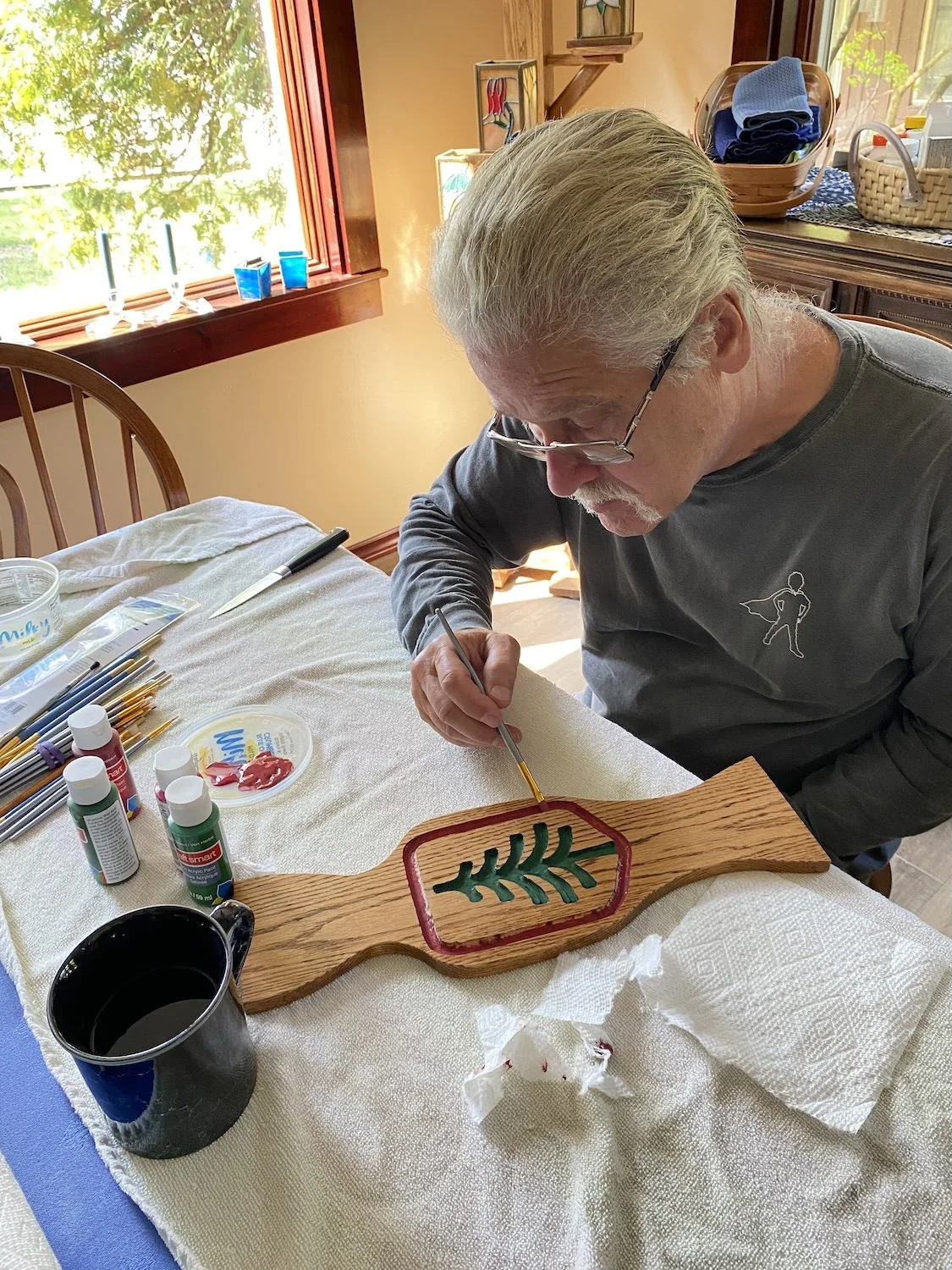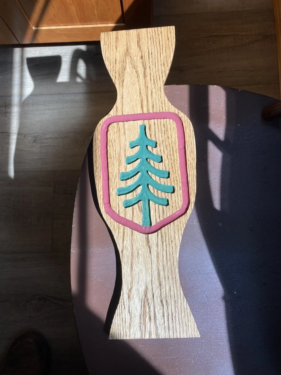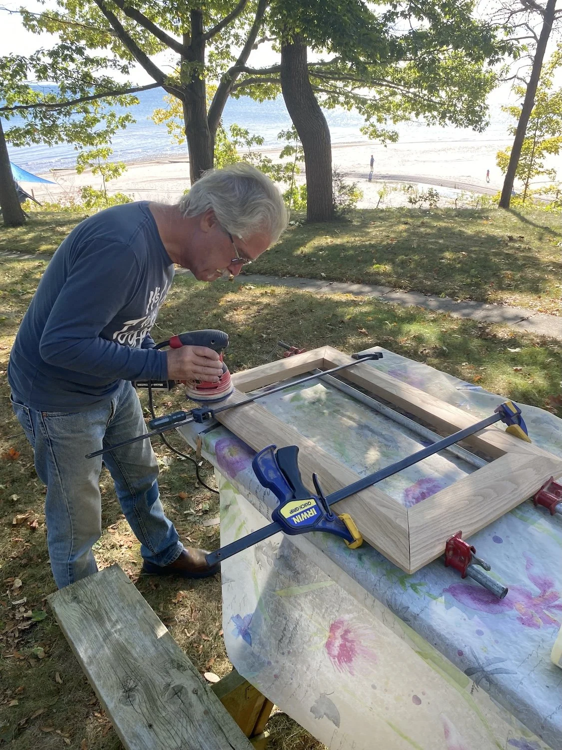 Finally, a finished panel that seemed to work. Shown here before the final coat of poly to seal the paint. This all took place at the lake over several months while I was trying to finish two other projects. At this point I sent this picture to Jack telling him I’d done the challenging part and now just needed to build a table around the panel.