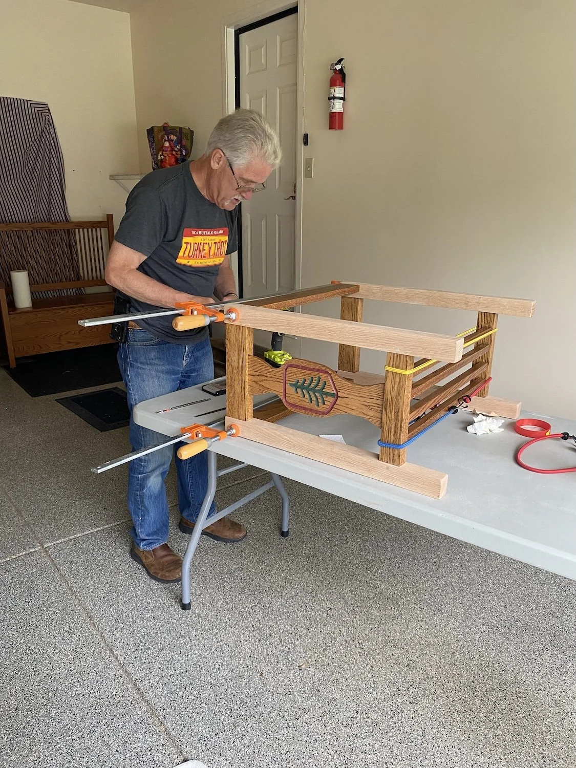 At this point the project moved from the lake to the townhouse as we were getting organized for fall and planning to go to K&E for the first time. Here I’m doing the final assembly of the base, attaching the skirting with pinned tenons and using the long stretchers to form a magazine rack that are mortise and tenon joined to the short stretchers.