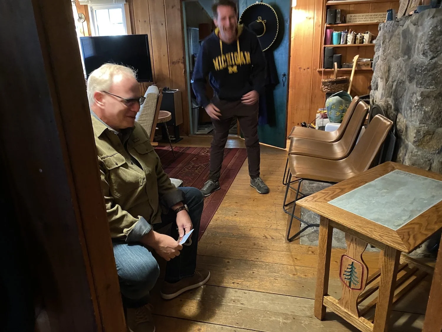 We took the table to Camp in pieces to make transport easier and I still hadn’t sealed the grout. Our second day at camp we sealed both the tile and the grout and attached the top to the base with L brackets to make future disassembly easier. Here is the final product in “Scott’s House” at K&E. I really like how the wide white oak wings give extra character to the top.