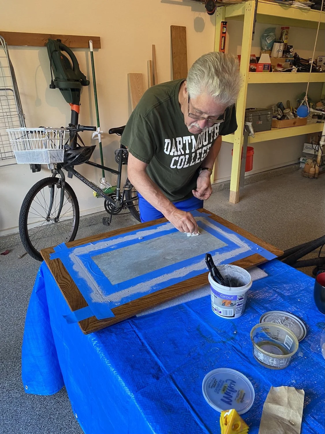 a piece of 3/4 inch plywood to form the center of the top and glued a floor tile to make up a nice hard surface for the bulk of the top. Here I am grouting the tile a day or two before we are to head for camp.
