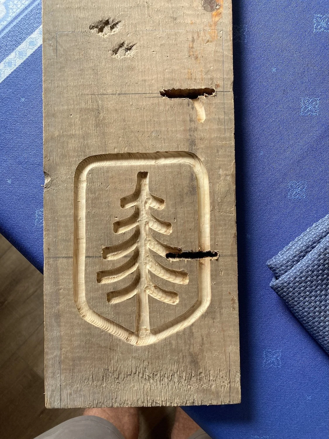 I experimented with some different flush router bits to get the shape and depth desired for each template. Then I clamped the shield pattern to the front panel I’d cut with the band saw and carefully slid the router along the perimeter to form the recessed shield. Then I clamped the tree template to the front panel making sure to orient it properly inside the shield. I used a smaller bit for this task to make sure to capture the squarish corners at the ends of the branches. Then I routed all around the inside perimeter of the template and then cleaned up anything left high on the interior of the template. This pic shows my first try on a beat up piece of scrap. I adjusted the depth slightly to make the final cut a little shallower.