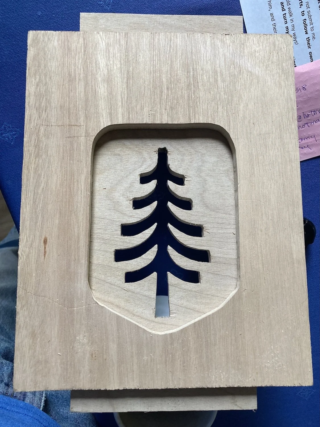 I drew up the shape of the front panel in a graphics package including the logo and then scaled it to the desired size. Then printed it onto a couple sheets of heavy paper, taped them together to form a full size pattern and cut out the shape of the panel. Then it was pretty straightforward to transfer the pattern to some 1/2 inch stock and cut it out on the band saw. I decided to try to make two templates for the logo. One would be the outside of the shield pattern, with the interior removed. The other would be the tree with everything tree removed. The patterns were transferred to the wood using paper patterns cut from the scaled printout. I didn’t own and had never worked with a scroll saw but it seemed to be the right tool for this job. So, I bought a scroll saw I’d been wanting and cut out a couple practice templates. Then I made the two templates pictured out of 1/2 inch plywood scraps. They are pictured stacked to show how routing just inside the perimeter of the shield and then routing inside the tree will yield the required pattern.